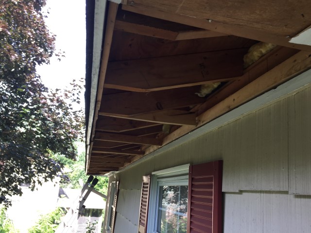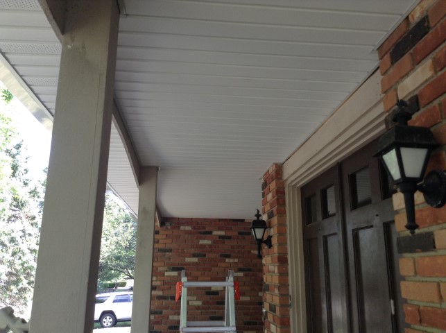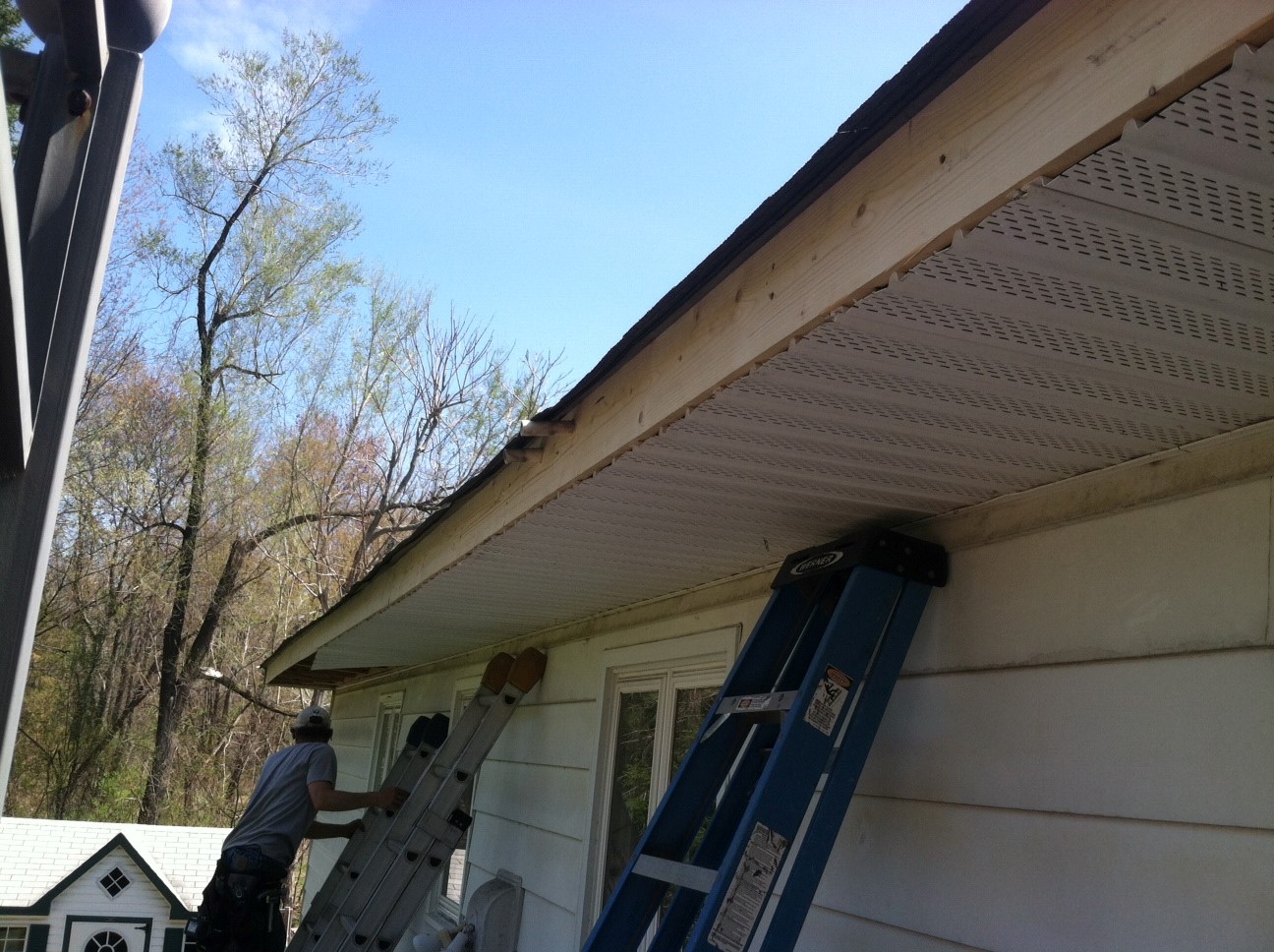 In the above photo we installed new 6" gutters and downspouts and replaced all of the soffits with new vinyl soffits.